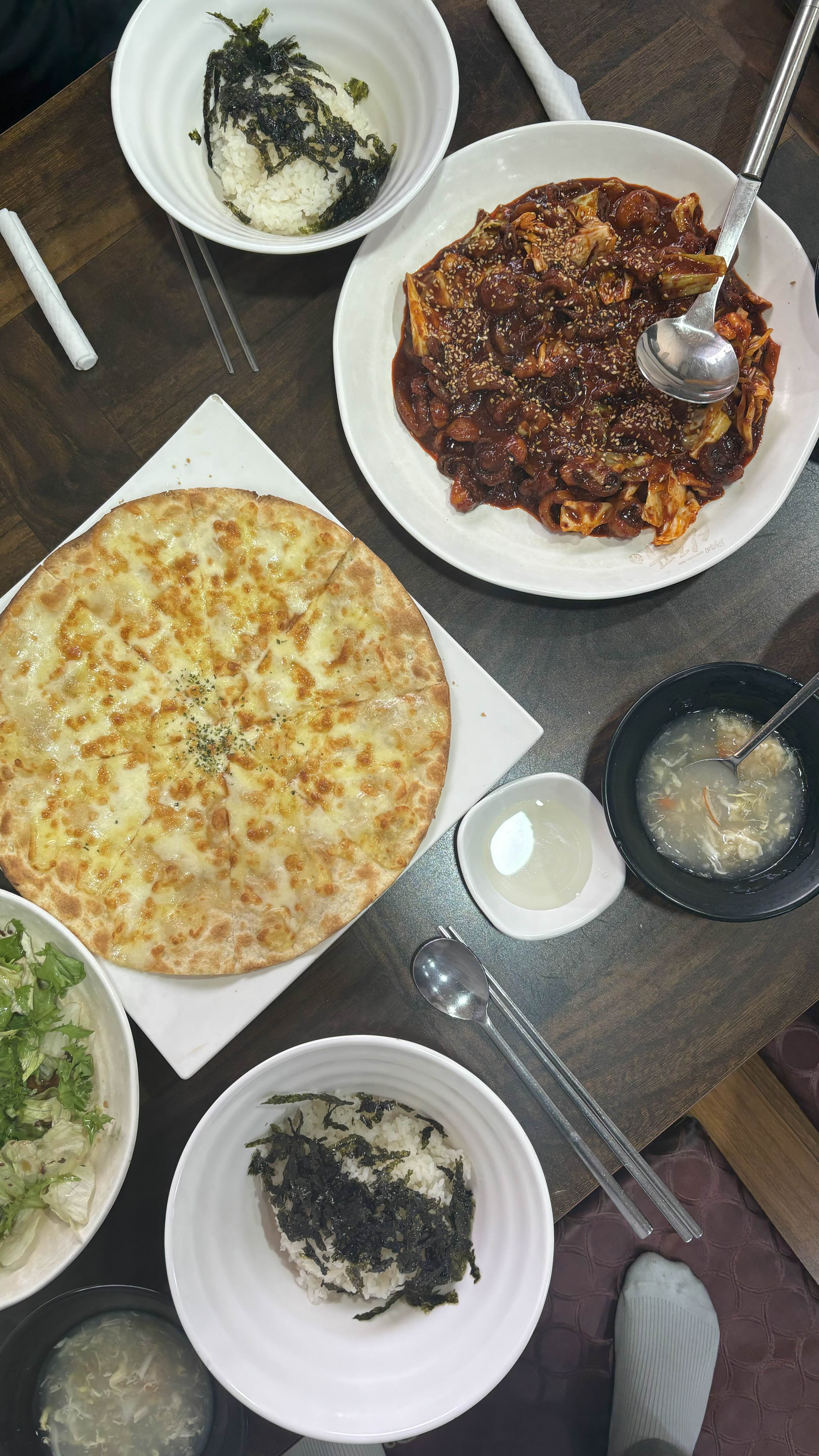 식전 게살죽 + 따듯한 보리차로 속을 따듯하게 데우고 메인으로 나오는 쭈꾸미 + 밥 + 도토리전 or 고르곤피자 ! 🤤